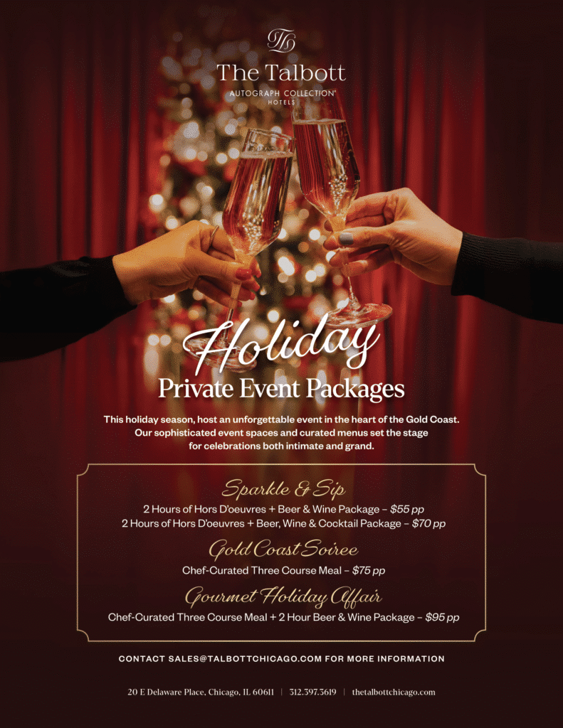 Located at 20 E Delaware Place, just steps from Rush Street, The Talbott combines its central Gold Coast location with flexible event spaces and customizable menus, making it a strong option for planners looking to host polished and memorable holiday celebrations. The on-site events team works directly with planners to tailor each package experience, from décor and menu selections to event flow and guest experience.